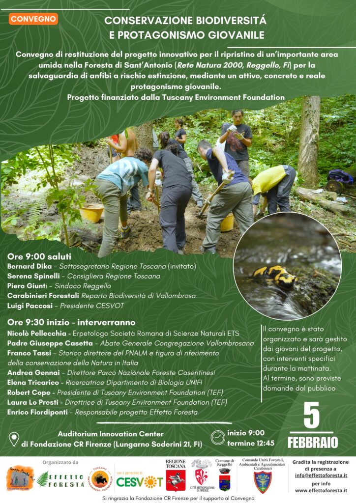Convegno di restituzione del progetto innovativo per il ripristino di un’importante area umida nella Foresta di Sant’Antonio (Rete Natura 2000, Reggello, Fi) per la salvaguardia di anfibi a rischio estinzione, mediante un attivo, concreto e reale protagonismo giovanile. Progetto finanziato dalla Tuscany Environment Foundation.