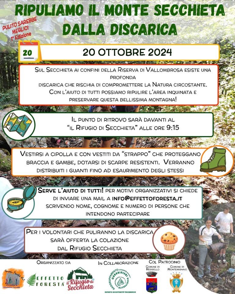 Per risanare l’area, noi di Effetto Foresta insieme al Rifugio di Secchieta in collaborazione con i Carabinieri Forestali di Vallombrosa e con il supporto dei Comuni di Montemignaio e di Reggello, abbiamo organizzato per il 20 ottobre 2024 dalle ore 9:15, una mattina di raccolta dei rifiuti della discarica, dove tutti insieme possiamo fare la differenza e contribuire tutti insieme per il bene comune naturale!